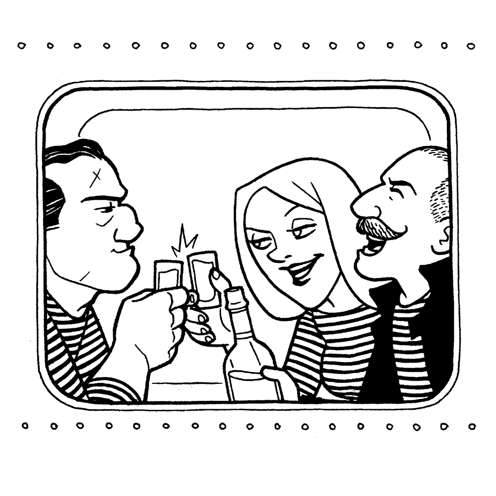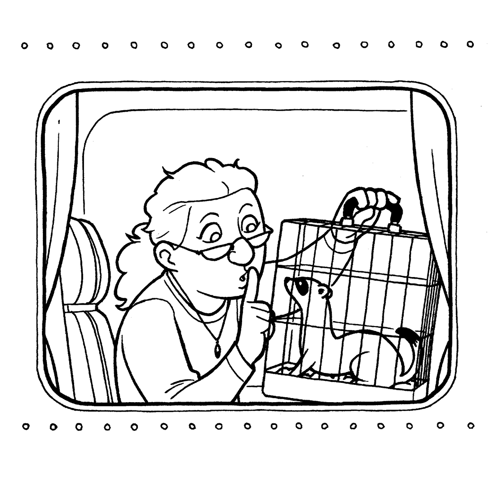 This collection contains 31 black & white drawings. Little scenes peering in at various characters on a train.